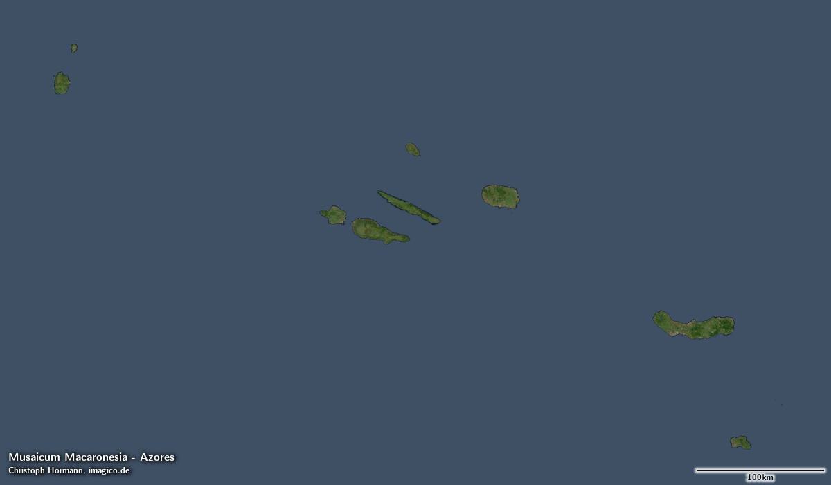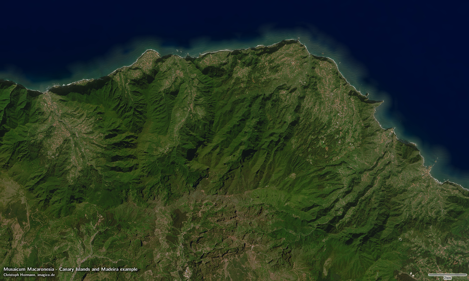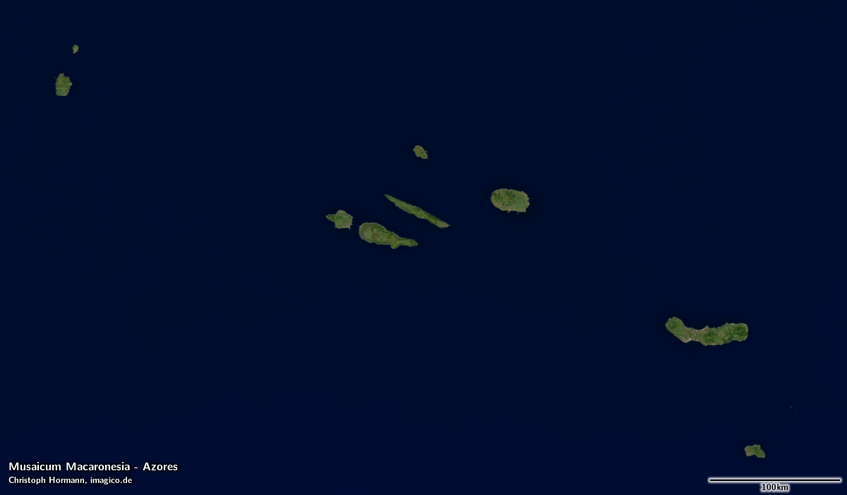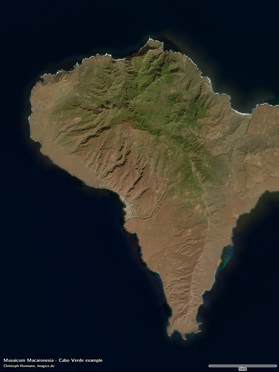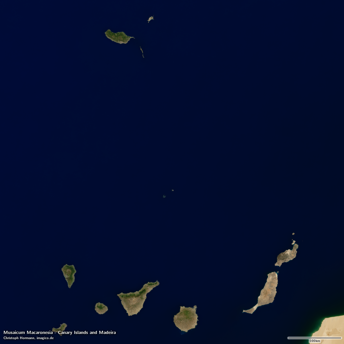The Musaicum Macaronesia is a regional visible color satellite image mosaic of the Azores, the Canary Islands, Madeira and Cabo Verde with a ground resolution of 10m. It combines recent Sentinel-2 satellite imagery into the highest quality and most cloud free depiction of the region in this resolution class available today.