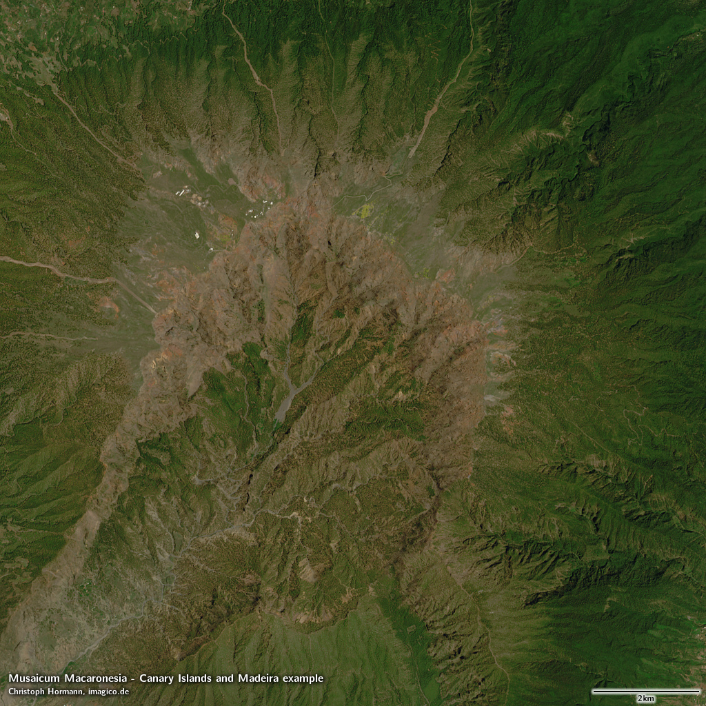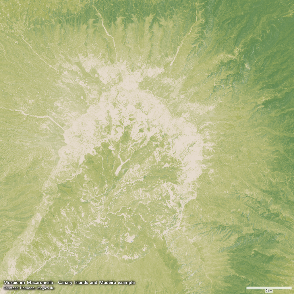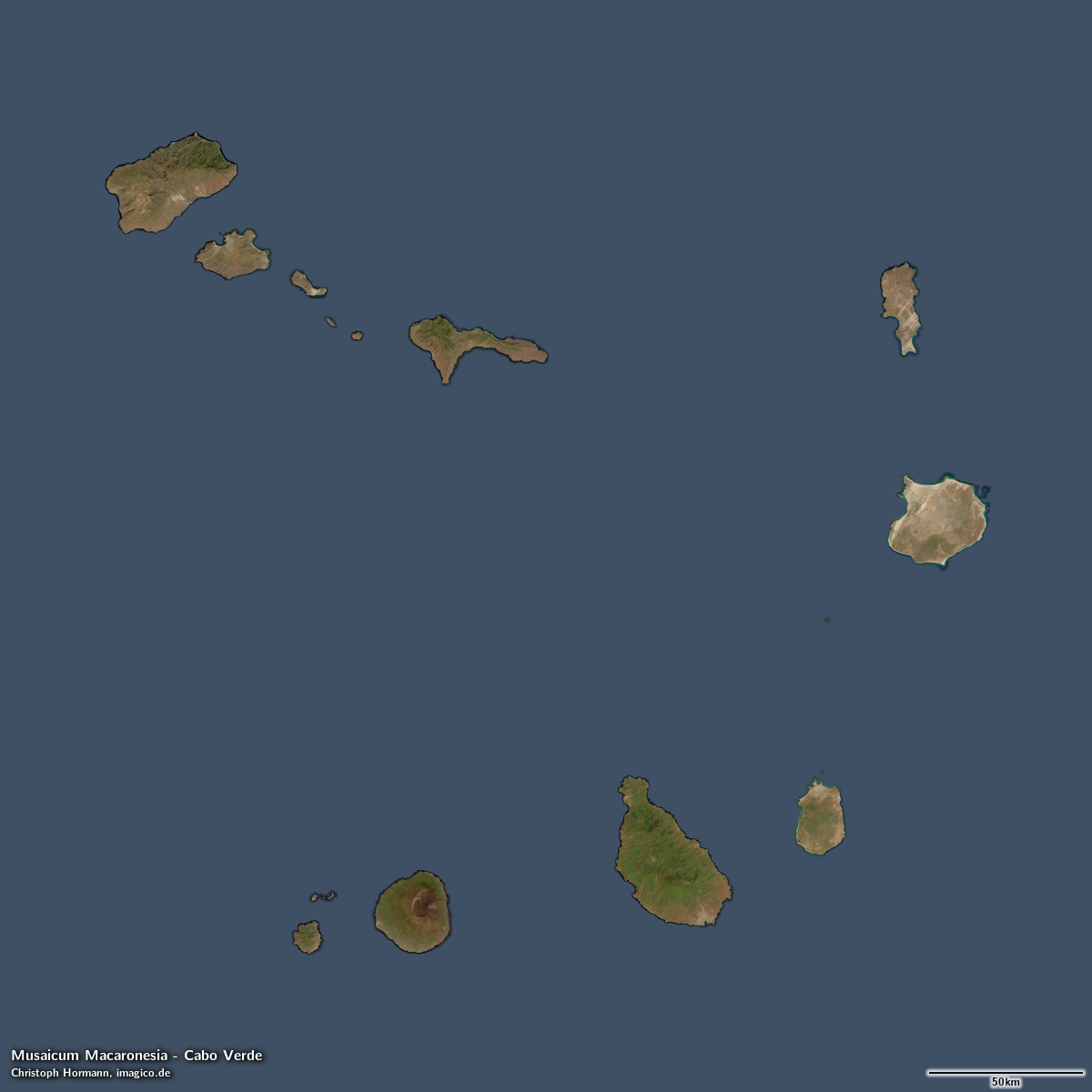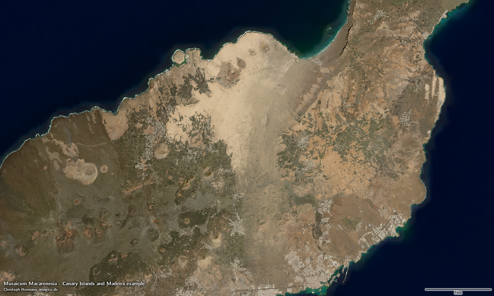 The Musaicum Macaronesia is a regional visible color satellite image mosaic of the Azores, the Canary Islands, Madeira and Cabo Verde with a ground resolution of 10m. It combines recent Sentinel-2 satellite imagery into the highest quality and most cloud free depiction of the region in this resolution class available today.